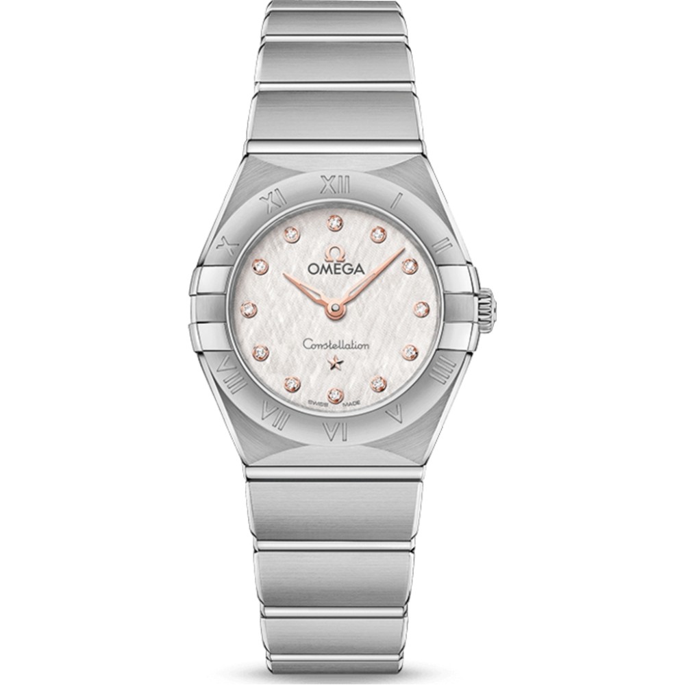 Omega Constellation Quartz 131.10.25.60.52.001 - ladies watch produced by Omega. It has Swiss quartz movement and 4061 calibre. Stainless steel case of round shape. Case dimensions are 25 mm. in diameter and 8.1 mm. in thickness. The dial of this Omega watch is silver. Display type: analog. This timepiece has sapphire, antireflection coating glass. Stainless steel band, band color: silver. 30 m. water resistance. The watch is from Constellation collection. The following features are equipped: diamond set.
