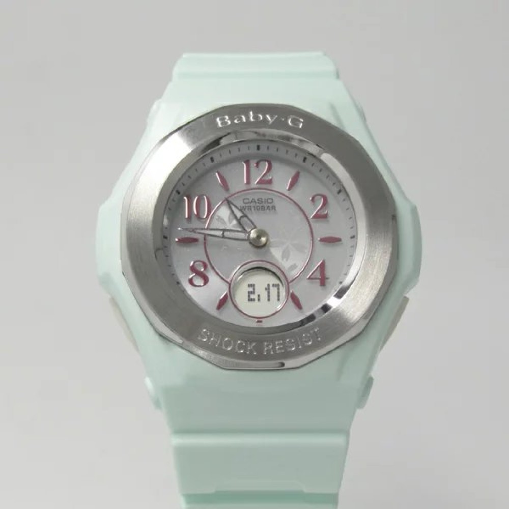 CASIO BABY-G BGA-1050BL-3BJF - ladies watch produced by Casio. It has Japanese solar quartz movement and 5133 calibre. Polymer, stainless steel case of round shape. Case dimensions are 38.9 mm. in diameter and 13.1 mm. in thickness. The dial of this Casio watch is gray. Display type: analog-digital. This timepiece has mineral glass. Polymer band, band color: green. 100 m. water resistance. The watch is from Baby-G collection. The following features are equipped: radio controlled, world time, chronograph, countdown timer, alarm, power reserve indicator, perpetual calendar, backlight, date, month.