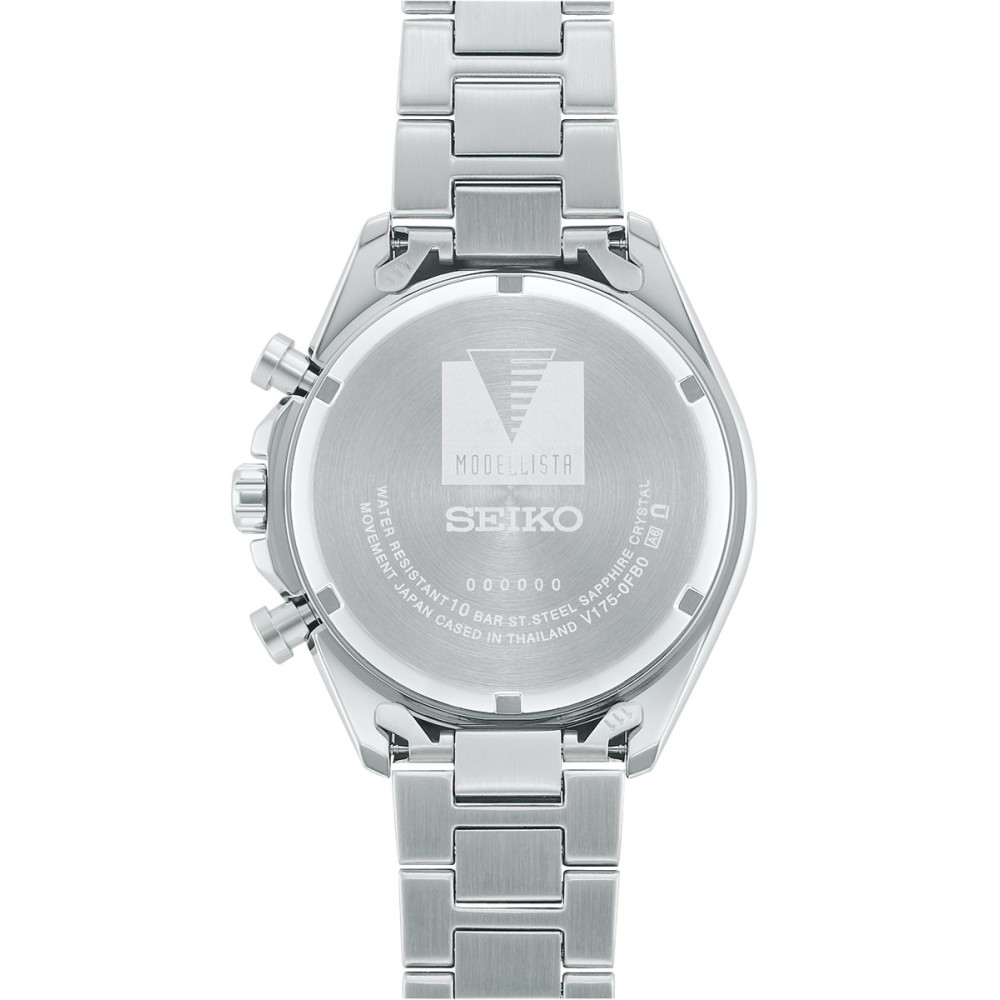 Seiko Selection Modellista Collaboration Model SBPY171 - men's watch produced by Seiko. It has Japanese solar quartz movement and V175 calibre. Stainless steel case of round shape. Case dimensions are 42.2 mm. in diameter and 12.2 mm. in thickness. The dial of this Seiko watch is black. Display type: analog. This timepiece has sapphire, super clear coating glass. Stainless steel band, band color: silver. 100 m. water resistance. The watch is from Seiko Selection collection. The following features are equipped: date, chronograph, glowing hands, glowing markers, antimagnetic.