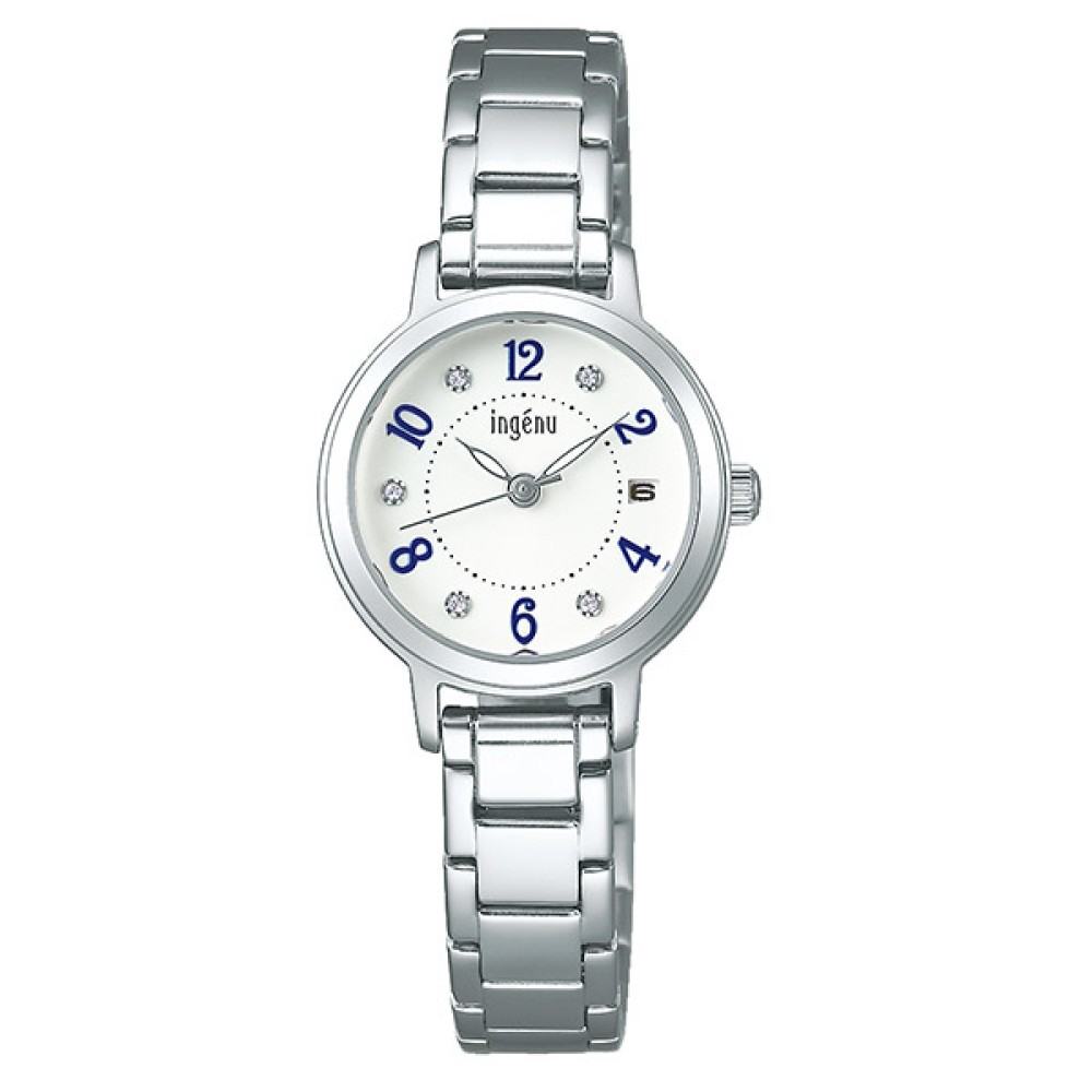 Seiko Alba ingenu AHJK444 - ladies watch made by Seiko. It is equipped with Japanese quartz movement and VJ22 calibre. Stainless steel case of round shape. Case dimensions are 24 mm. in diameter and 7.5 mm. in thickness. The dial of this Seiko watch is white. Display type: analog. This timepiece has hardlex glass. Stainless steel band, band color: silver. 50 m. water resistance. The watch is from Alba collection. The following features are equipped: date, crystal set.