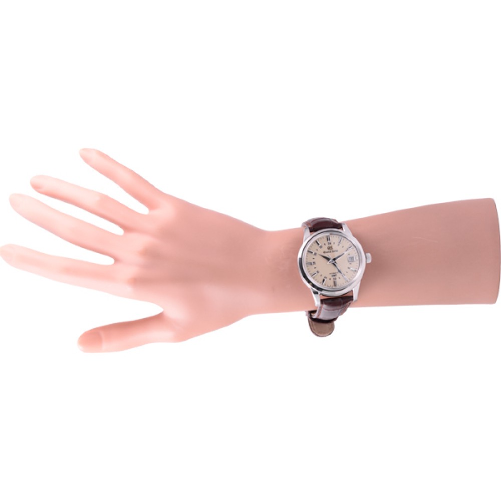 Grand Seiko SBGM221 - men's watch manufactured by Seiko. It is equipped with Japanese automatic movement and 9S66 calibre. Stainless steel case of round shape. Case dimensions are 39.5 mm. in diameter and 13.7 mm. in thickness. The dial of this Grand Seiko watch is beige. Display type: analog. This timepiece has sapphire, antireflection coating glass. Crocodile leather band, band color: brown. 30 m. water resistance. The watch is from Grand Seiko Elegance collection. The following features are equipped: antimagnetic, date, dual time.