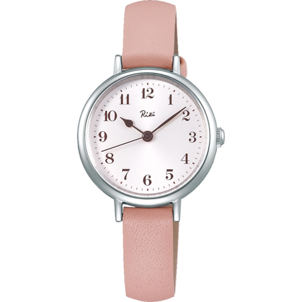 Seiko Alba Riki Watanabe AKQK447 - ladies watch manufactured by Seiko. It is equipped with Japanese quartz movement and VJ21 calibre. Stainless steel case of round shape. Case dimensions are 28 mm. in diameter and 7.4 mm. in thickness. The dial of this Seiko watch is pink. Display type: analog. This timepiece has hardlex glass. Leather band, band color: pink. 30 m. water resistance. The watch is from Alba collection.