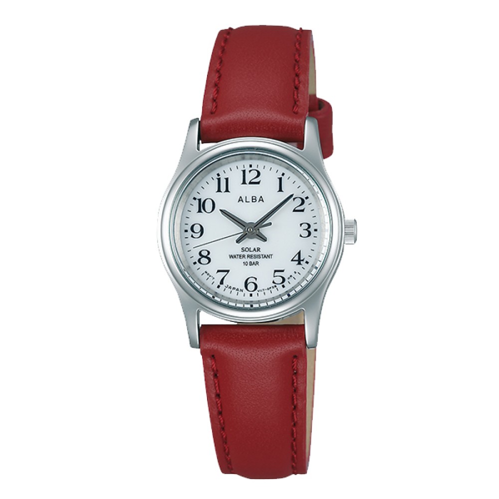Seiko Alba Solar AEGD561 - ladies watch made by Seiko. It has Japanese solar quartz movement and V117 calibre. Stainless steel case of round shape. Case dimensions are 24.5 mm. in diameter and 7.1 mm. in thickness. The dial of this Seiko watch is white. Display type: analog. This timepiece has hardlex glass. Leather band, band color: red. 100 m. water resistance. The watch is from Alba collection.