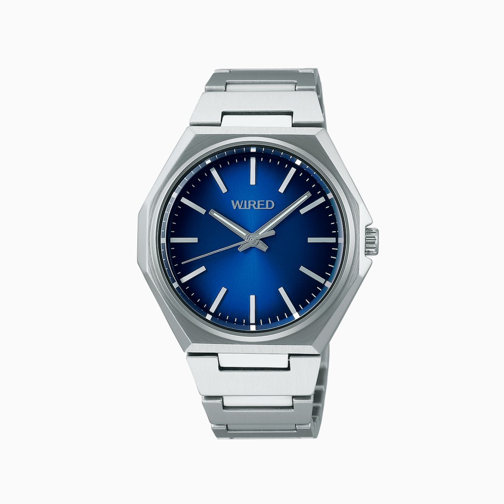 Seiko Wired AGAK405 - men's watch made by Seiko. It has Japanese quartz movement and VJ21 calibre. Stainless steel case of round shape. Case dimensions are 41.3 mm. in diameter and 8.7 mm. in thickness. The dial of this Seiko watch is blue. Display type: analog. This timepiece has hardlex glass. Stainless steel band, band color: silver. 100 m. water resistance. The watch is from Wired collection. The following features are equipped: glowing hands.