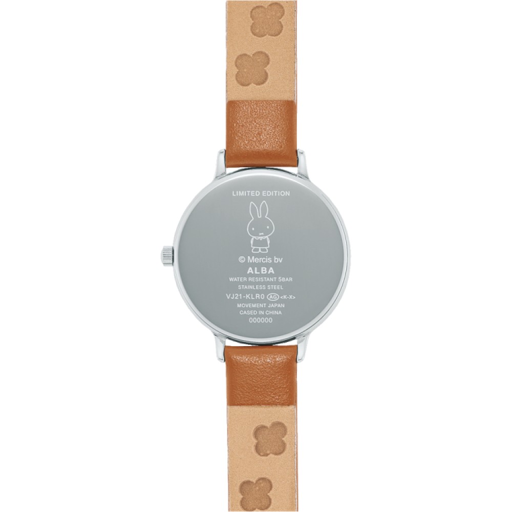 Seiko Alba Ingènu Miffy Collaboration Limited Model AHJK736 - ladies watch produced by Seiko. It has Japanese quartz movement and VJ21 calibre. Stainless steel case of round shape. Case dimensions are 30 mm. in diameter and 7.3 mm. in thickness. The dial of this Seiko watch is white. Display type: analog. This timepiece has mineral glass. Calf leather band, band color: light brown. 50 m. water resistance. The watch is from Alba collection. The following features are equipped: limited edition.