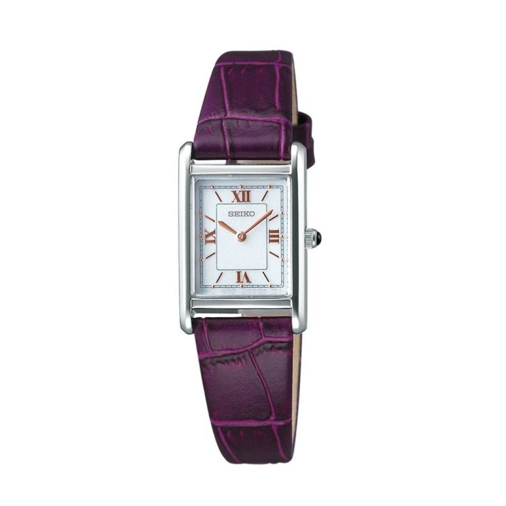 Seiko Selection nano ・ universe Special Edition STPR065 - ladies watch produced by Seiko. It has Japanese solar quartz movement and V115 calibre. Stainless steel case of rectangle shape. Case dimensions are 18 mm. in diameter and 5.9 mm. in thickness. The dial of this Seiko watch is white. Display type: analog. This timepiece has hardlex glass. Leather band, band color: purple. 30 m. water resistance. The watch is from Seiko Selection collection. The following features are equipped: antimagnetic.
