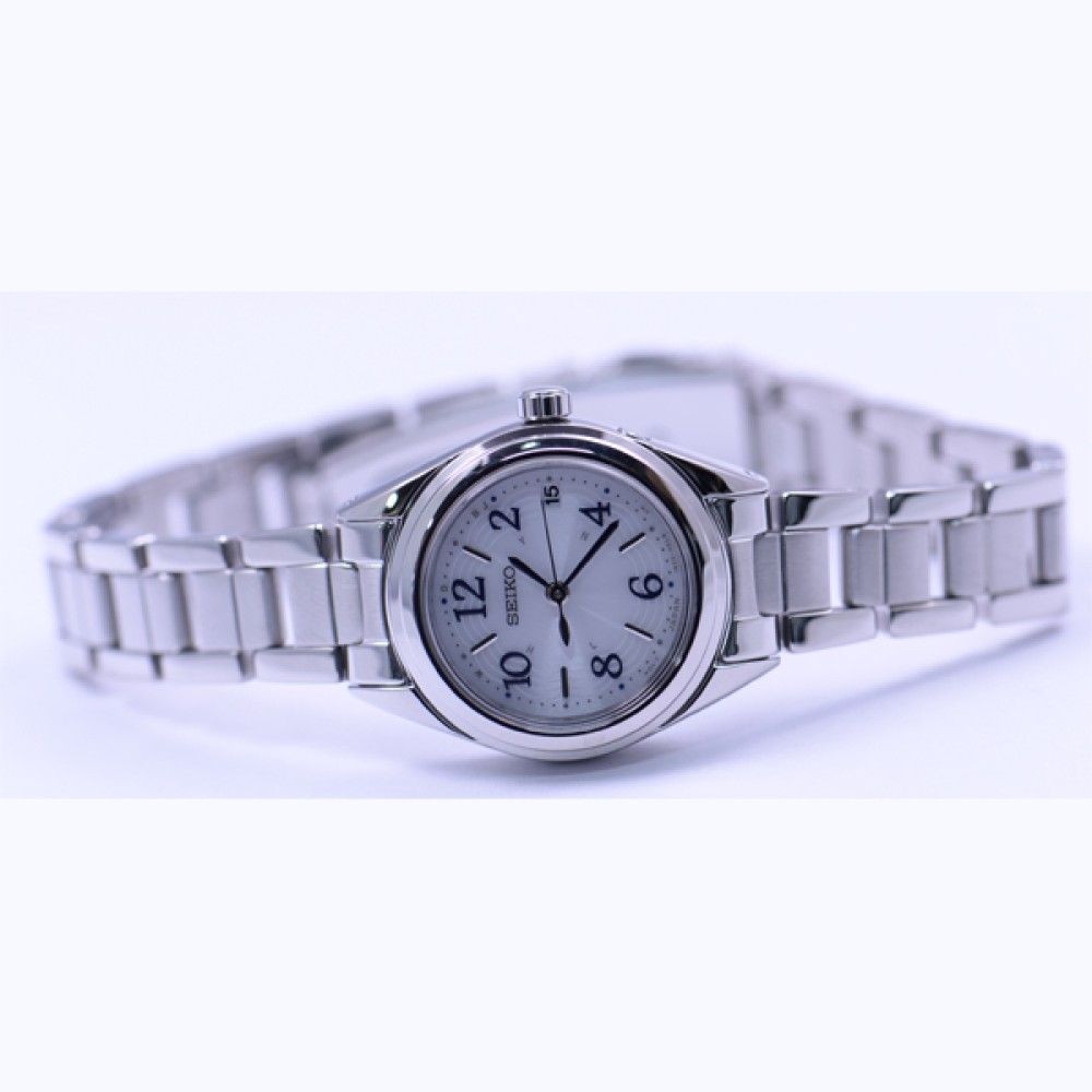 Seiko Selection SWFH073 - ladies watch produced by Seiko. It has Japanese solar quartz movement and 1B22 calibre. Stainless steel case of round shape. Case dimensions are 25.2 mm. in diameter and 7.6 mm. in thickness. The dial of this Seiko watch is white. Display type: analog. This timepiece has hardlex glass. Stainless steel band, band color: silver. 100 m. water resistance. The watch is from Seiko Selection collection. The following features are equipped: antimagnetic, date, perpetual calendar, radio controlled.