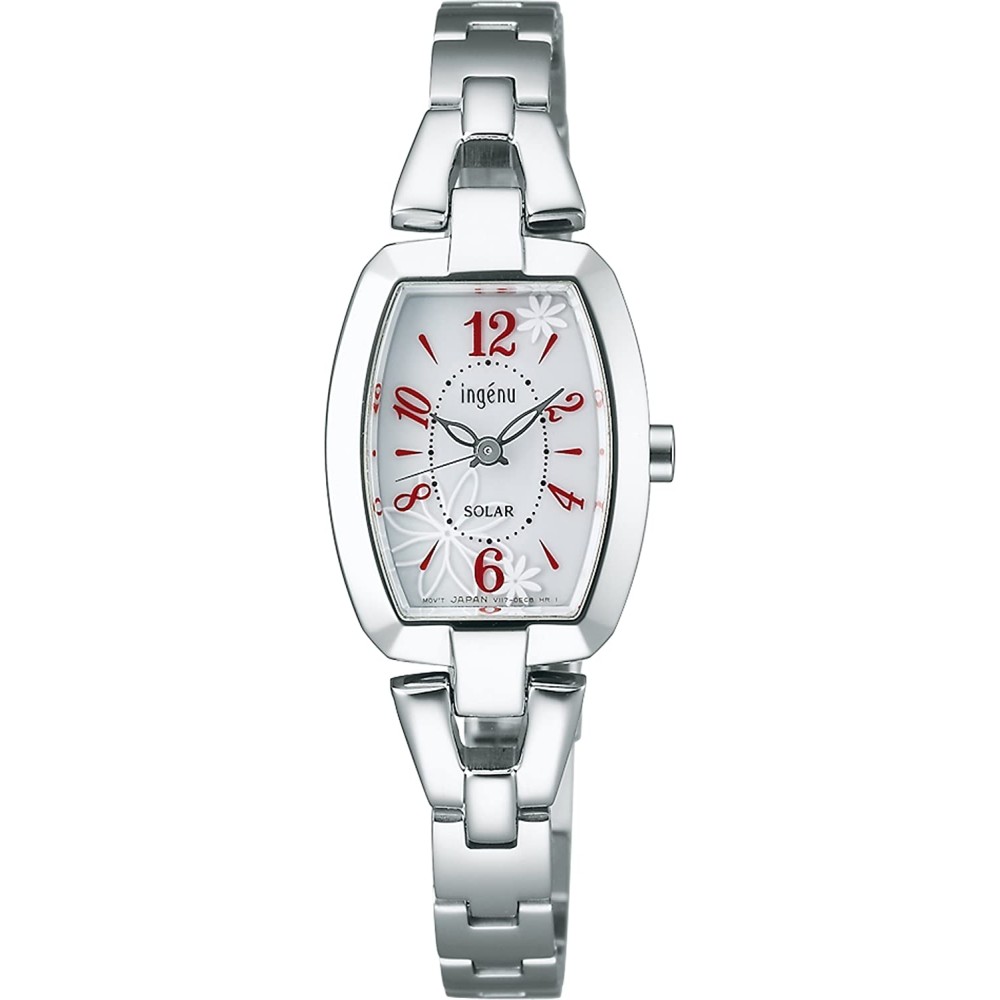 Seiko Alba ingenu AHJD059 - ladies watch produced by Seiko. It is equipped with Japanese solar quartz movement and V117 calibre. Stainless steel case of tonneau shape. Case dimensions are 19.5 mm. in diameter and 6.7 mm. in thickness. The dial of this Seiko watch is white. Display type: analog. This timepiece has hardlex glass. Stainless steel band, band color: silver. 100 m. water resistance. The watch is from Alba collection.