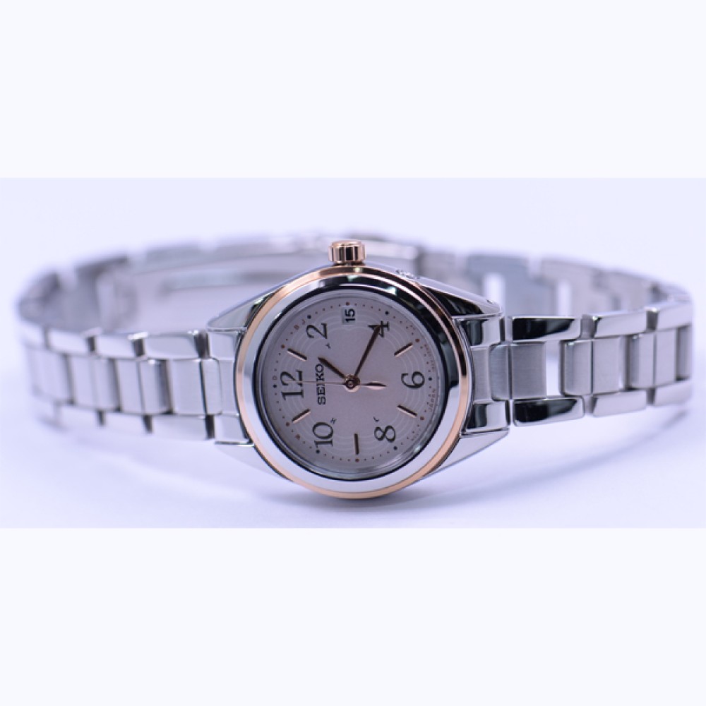Seiko Selection SWFH076 - ladies watch produced by Seiko. It is equipped with Japanese solar quartz movement and 1B22 calibre. Stainless steel, gold plated case of round shape. Case dimensions are 25.2 mm. in diameter and 7.6 mm. in thickness. The dial of this Seiko watch is pink. Display type: analog. This timepiece has hardlex glass. Stainless steel band, band color: silver. 100 m. water resistance. The watch is from Seiko Selection collection. The following features are equipped: antimagnetic, date, radio controlled, perpetual calendar.