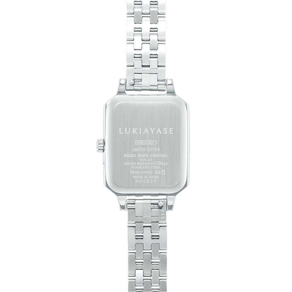 Seiko Lukia LUKIAYASE LUKIA 25th Anniversary Limited Edition SSVW175 - ladies watch manufactured by Seiko. It is equipped with Japanese solar quartz movement and 1B32 calibre. Stainless steel case of rectangle shape. Case dimensions are 23.9 mm. in diameter and 7.9 mm. in thickness. The dial of this Seiko watch is white, mother of pearl. Display type: analog. This timepiece has sapphire, super clear coating glass. Stainless steel, leather, crocodile band, band color: silver, black, white, blue. 100 m. water resistance. The watch is from Seiko Lukia collection. The following features are equipped: date, antimagnetic, radio controlled, limited edition, diamond set, perpetual calendar.