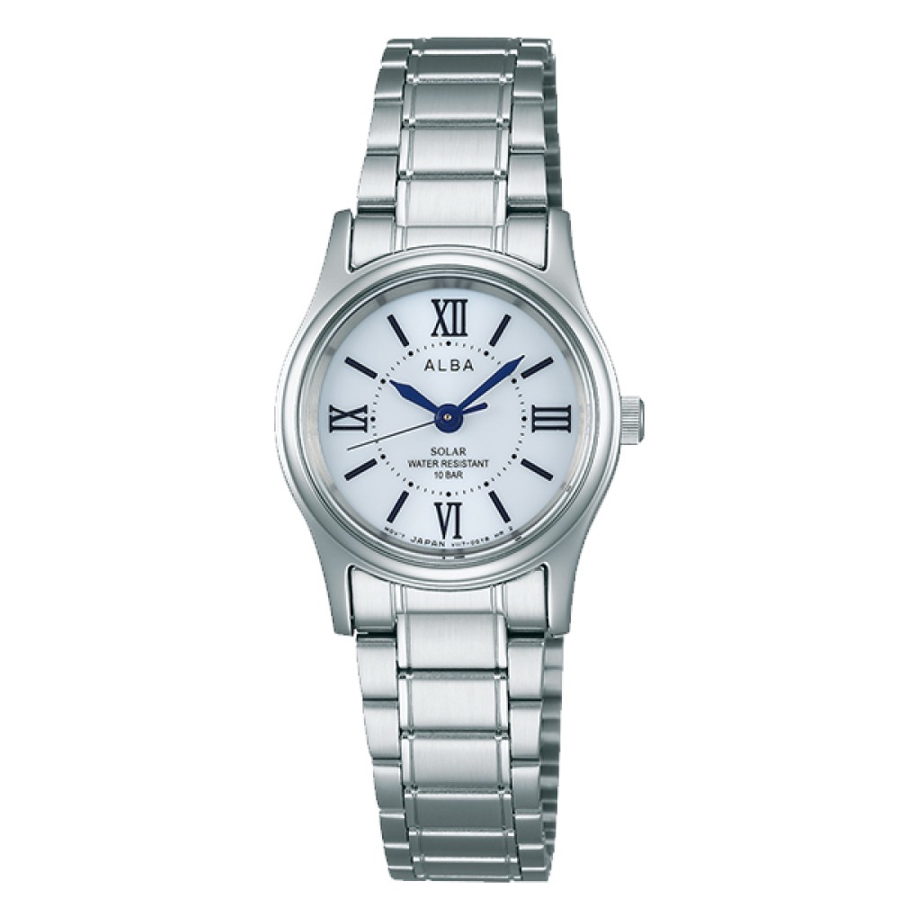 Seiko Alba Solar AEGD554 - ladies watch made by Seiko. It has Japanese solar quartz movement and V117 calibre. Stainless steel case of round shape. Case dimensions are 24.5 mm. in diameter and 7.1 mm. in thickness. The dial of this Seiko watch is white. Display type: analog. This timepiece has hardlex glass. Stainless steel band, band color: silver. 100 m. water resistance. The watch is from Alba collection.