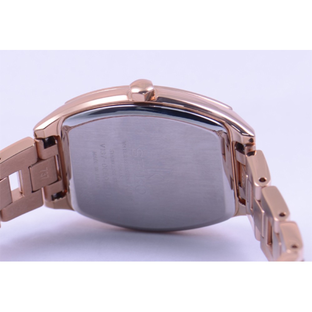 Seiko Lukia SSVN028 - ladies watch made by Seiko. It has Japanese solar quartz movement and V137 calibre. Stainless steel, gold plated case of tonneau shape. Case dimensions are 26 mm. in diameter and 7.3 mm. in thickness. The dial of this Seiko watch is white. Display type: analog. This timepiece has sapphire, super clear coating glass. Stainless steel, gold plated band, band color: gold. 100 m. water resistance. The watch is from Seiko Lukia collection. The following features are equipped: antimagnetic, date, glowing hands.