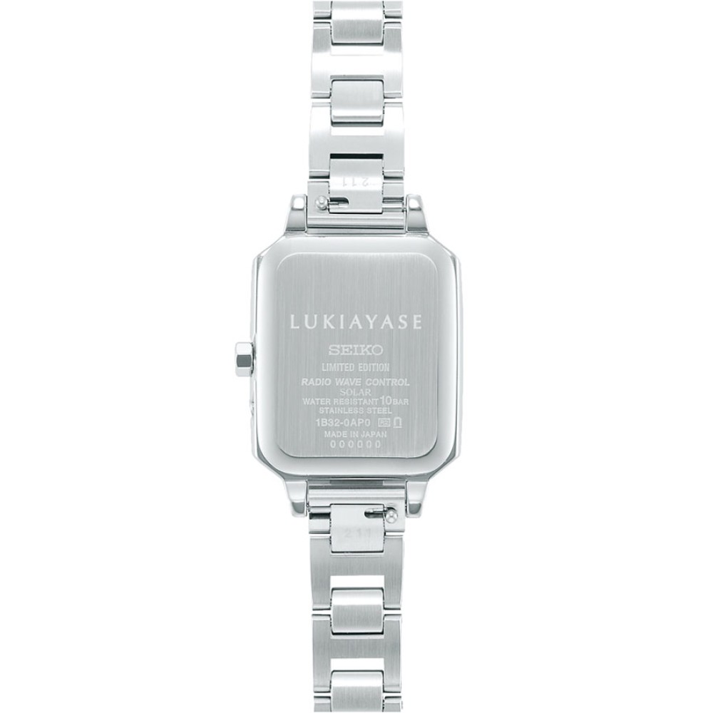 Seiko Lukia LUKIAYASE LUKIA 25th Anniversary Limited Edition SSVW177 - ladies watch produced by Seiko. It is equipped with Japanese solar quartz movement and 1B32 calibre. Stainless steel case of rectangle shape. Case dimensions are 23.9 mm. in diameter and 7.7 mm. in thickness. The dial of this Seiko watch is silver. Display type: analog. This timepiece has sapphire, super clear coating glass. Stainless steel, leather band, band color: silver, black. 100 m. water resistance. The watch is from Seiko Lukia collection. The following features are equipped: date, antimagnetic, radio controlled, limited edition, diamond set, perpetual calendar.
