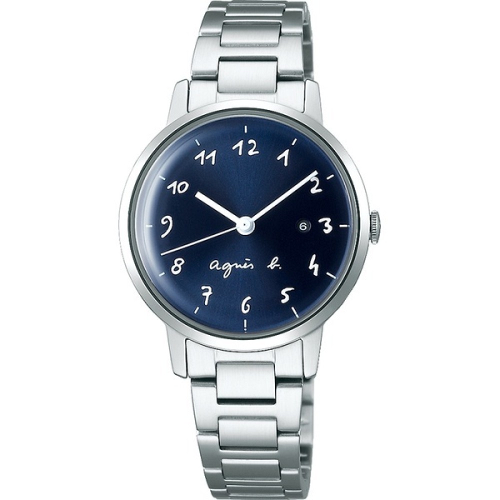 Seiko agnes.b Marcello! FCSK934 - ladies watch produced by Seiko. It has Japanese quartz movement and VJ22 calibre. Stainless steel case of round shape. Case dimensions are 30 mm. in diameter and 8 mm. in thickness. The dial of this Seiko watch is blue. Display type: analog. This timepiece has hardlex glass. Stainless steel band, band color: silver. 50 m. water resistance. The watch is from agnes b. collection. The following features are equipped: date.