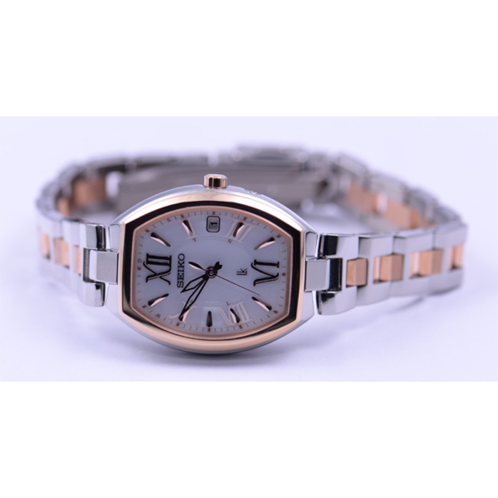 Seiko Lukia SSQW028 - ladies watch made by Seiko. It has Japanese solar quartz movement and 1B22 calibre. Titanium, hard coating, gold plated case of tonneau shape. Case dimensions are 25.6 mm. in diameter and 8.9 mm. in thickness. The dial of this Seiko watch is white. Display type: analog. This timepiece has sapphire, super clear coating glass. Titanium, hard coating, gold plated band, band color: silver, gold. 100 m. water resistance. The watch is from Seiko Lukia collection. The following features are equipped: antimagnetic, date, radio controlled, perpetual calendar.