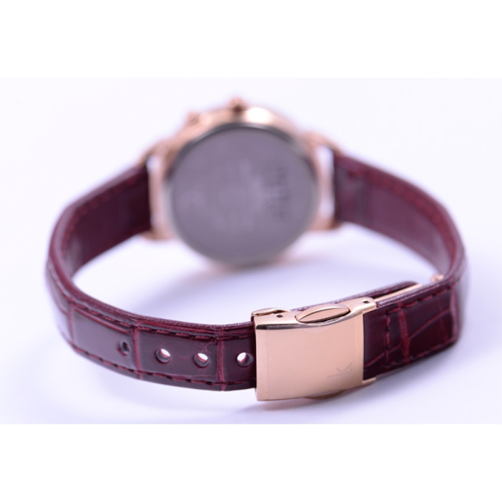 Seiko Lukia SSQV022 - ladies watch made by Seiko. It has Japanese solar quartz movement and 1B25 calibre. Titanium, gold plated case of round shape. Case dimensions are 28.5 mm. in diameter and 9.2 mm. in thickness. The dial of this Seiko watch is silver. Display type: analog. This timepiece has sapphire, super clear coating glass. Crocodile leather band, band color: red. 100 m. water resistance. The watch is from Seiko Lukia collection. The following features are equipped: date, radio controlled, perpetual calendar, world time, antimagnetic, glowing hands.