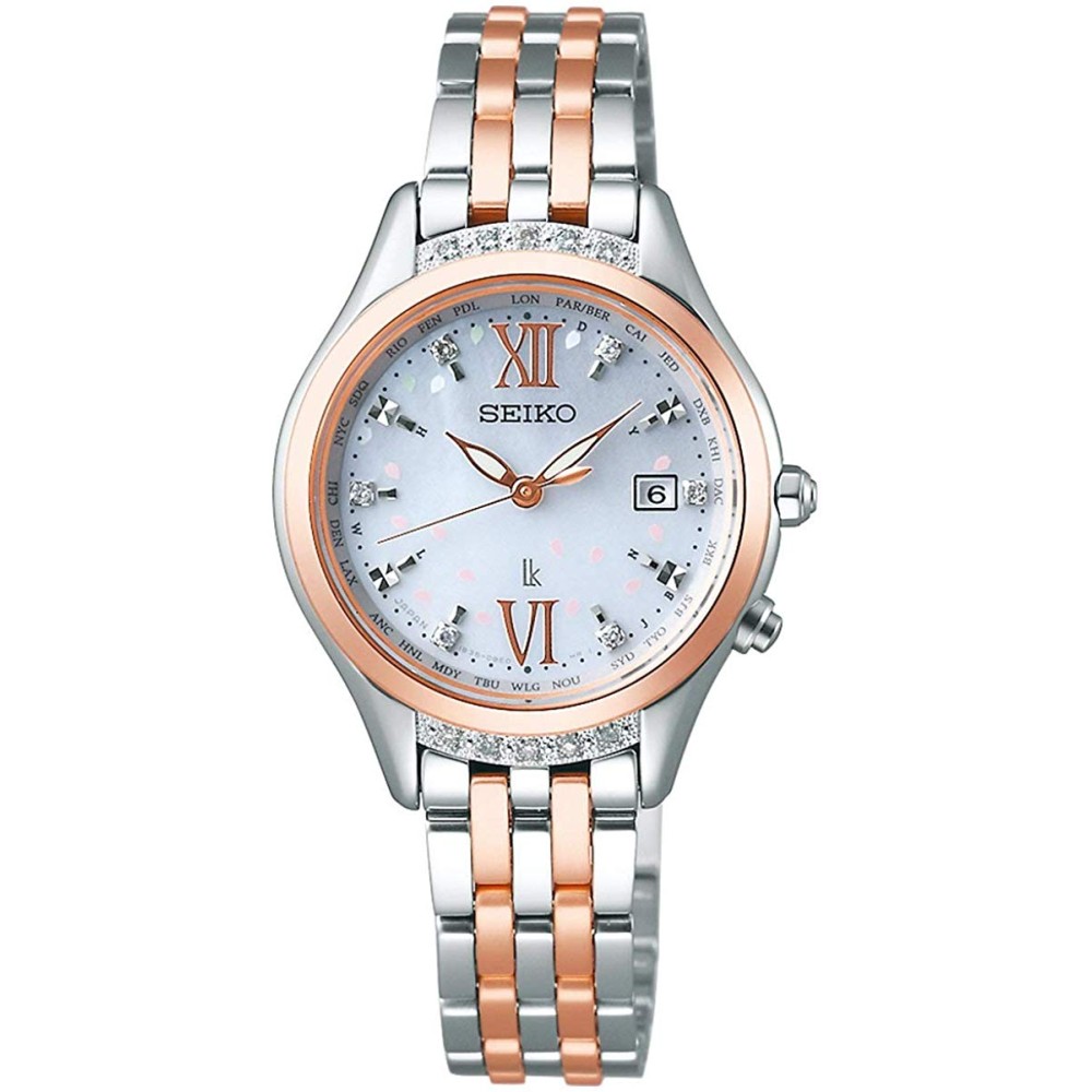 Seiko Lukia 2020 SAKURA Blooming Limited Model SSVV058 - ladies watch made by Seiko. It has Japanese solar quartz movement and 1B35 calibre. Stainless steel, hard coating, gold plated case of round shape. Case dimensions are 28.1 mm. in diameter and 7.6 mm. in thickness. The dial of this Seiko watch is mother of pearl. Display type: analog. This timepiece has sapphire, super clear coating glass. Stainless steel, hard coating, gold plated band, band color: silver, gold. 100 m. water resistance. The watch is from Seiko Lukia collection. The following features are equipped: radio controlled, glowing hands, antimagnetic, diamond set, date, perpetual calendar, world time, limited edition.