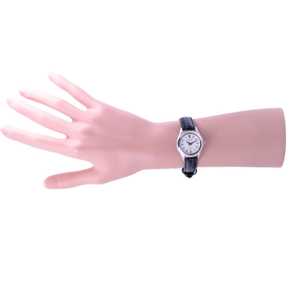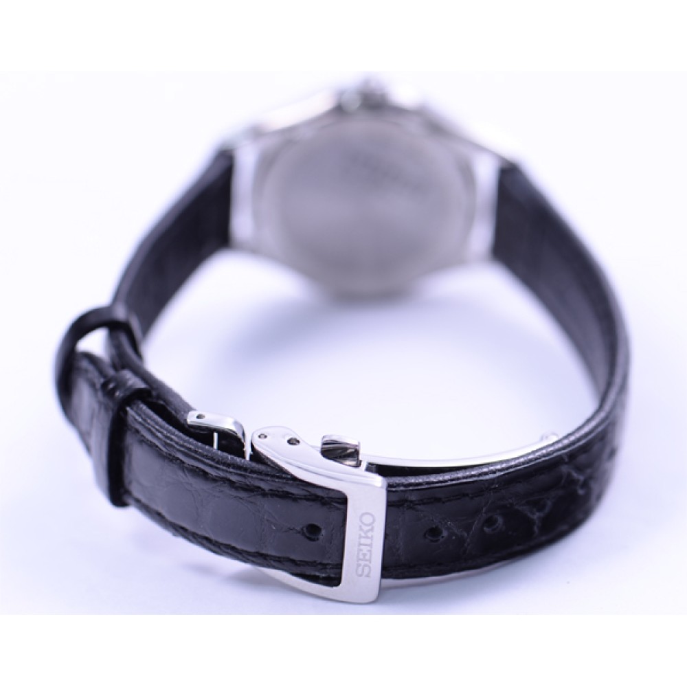 Seiko Exceline SWCP009 - ladies watch manufactured by Seiko. It is equipped with Japanese solar quartz movement and V131 calibre. Titanium, hard coating case of round shape. Case dimensions are 27.5 mm. in diameter and 7 mm. in thickness. The dial of this Seiko watch is white. Display type: analog. This timepiece has sapphire, super clear coating glass. Crocodile leather band, band color: black. 100 m. water resistance. The watch is from Seiko Dolce & Exceline collection. The following features are equipped: antimagnetic.