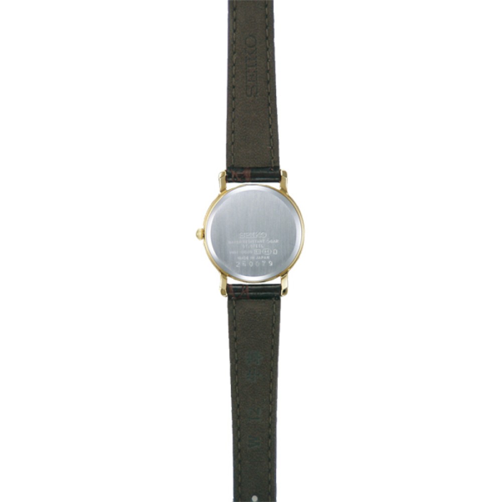 Seiko Selection SSDA034 - ladies watch made by Seiko. It is equipped with Japanese quartz movement and 1N01 calibre. Stainless steel, gold plated case of round shape. Case dimensions are 23.7 mm. in diameter and 5.6 mm. in thickness. The dial of this Seiko watch is gold. Display type: analog. This timepiece has sapphire glass. Leather band, band color: brown. 50 m. water resistance. The watch is from Seiko Selection collection. The following features are equipped: antimagnetic.