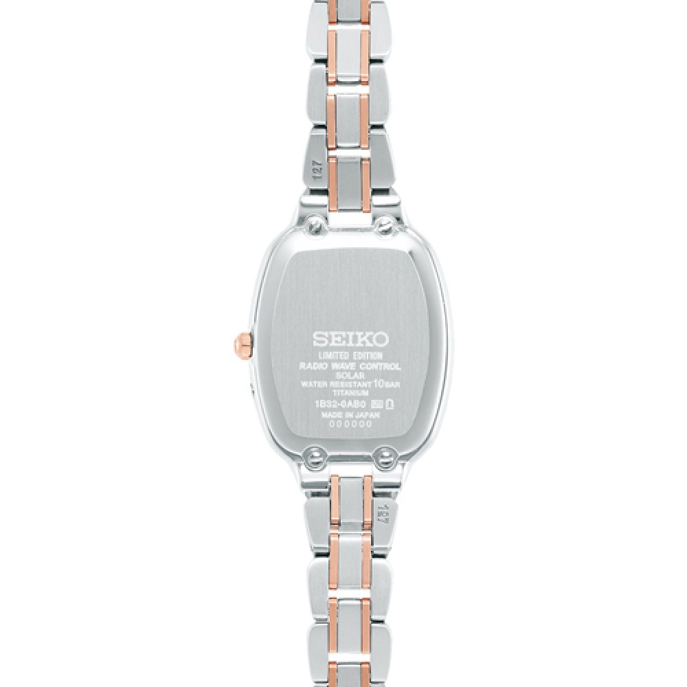 Seiko Exceline SWCW138 - ladies watch manufactured by Seiko. It has Japanese solar quartz movement and 1B32 calibre. Titanium, hard coating, gold plated case of tonneau shape. Case dimensions are 25 mm. in diameter and 8.3 mm. in thickness. The dial of this Seiko watch is white. Display type: analog. This timepiece has sapphire, super clear coating glass. Titanium, hard coating, gold plated band, band color: silver, gold. 100 m. water resistance. The watch is from Seiko Dolce & Exceline collection. The following features are equipped: antimagnetic, date, limited edition, perpetual calendar, radio controlled, diamond set.
