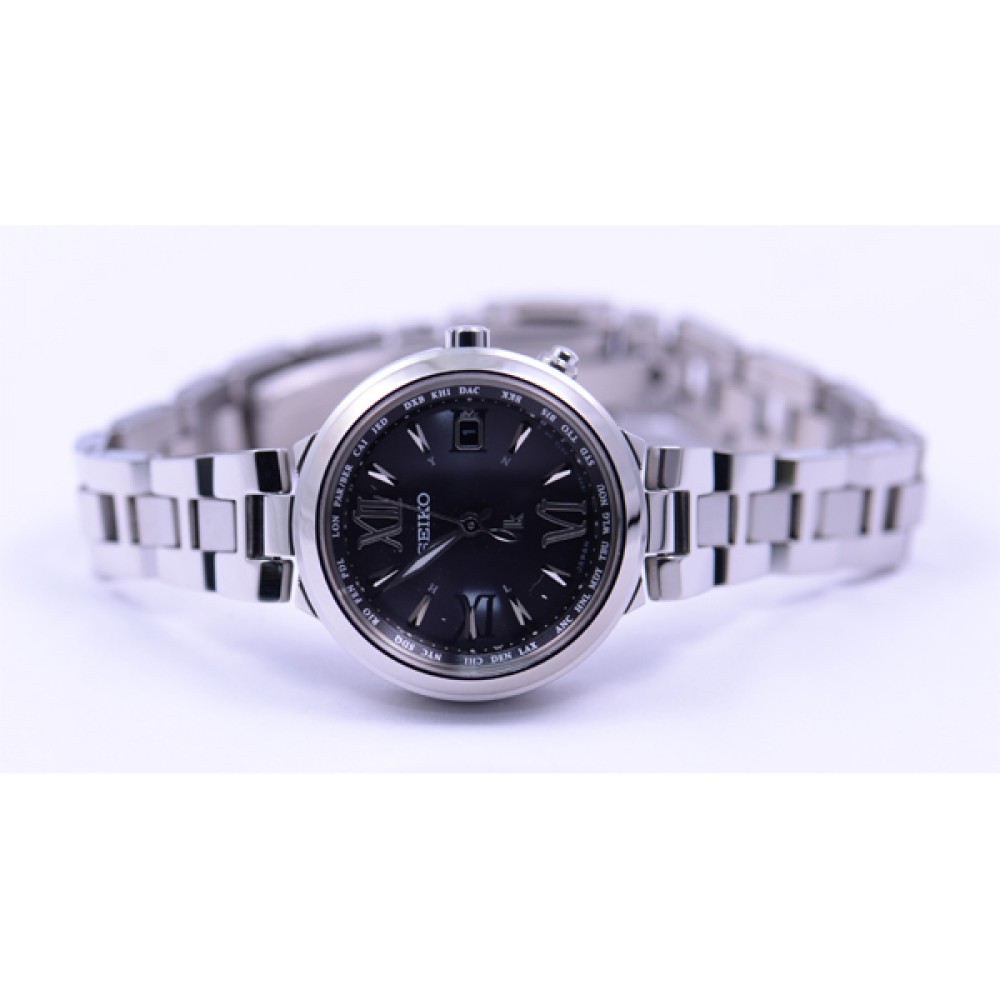Seiko Lukia SSVV019 - ladies watch manufactured by Seiko. It is equipped with Japanese solar quartz movement and 1B25 calibre. Stainless steel, hard coating case of round shape. Case dimensions are 28 mm. in diameter and 9.3 mm. in thickness. The dial of this Seiko watch is black. Display type: analog. This timepiece has sapphire, super clear coating glass. Stainless steel, hard coating band, band color: silver. 100 m. water resistance. The watch is from Seiko Lukia collection. The following features are equipped: antimagnetic, date, perpetual calendar, world time, radio controlled, glowing hands.