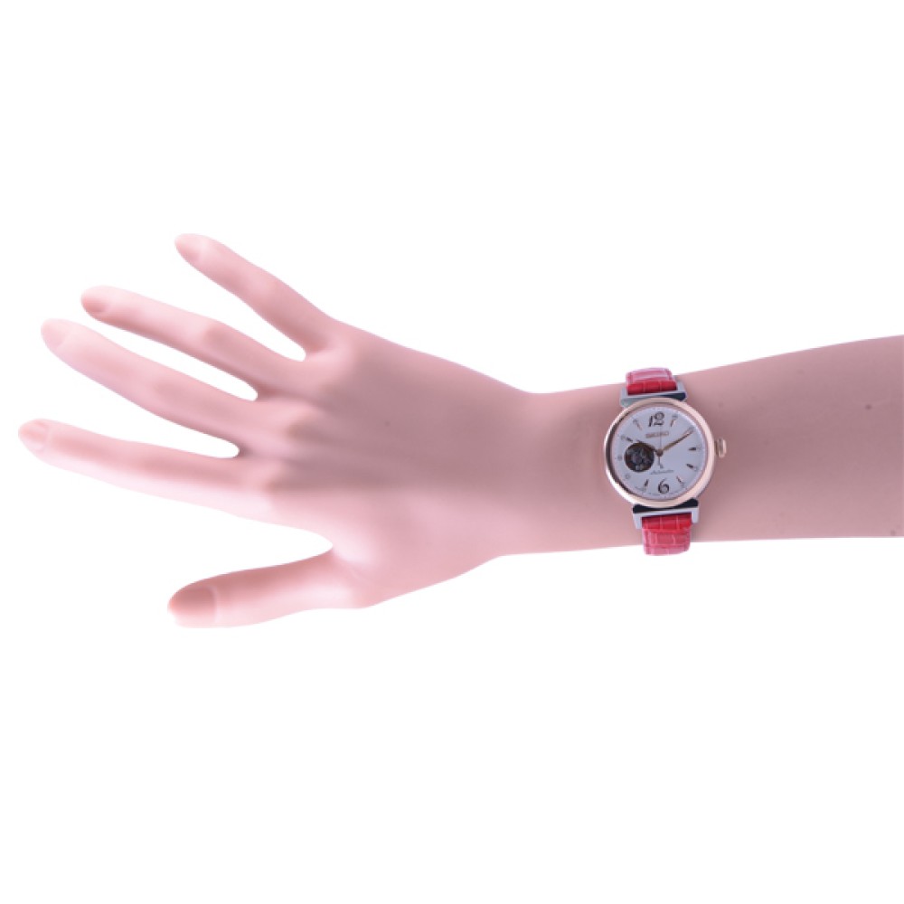 Seiko Lukia SSVM012 - ladies watch produced by Seiko. It has Japanese automatic movement and 4R38 calibre. Stainless steel, gold plated case of round shape. Case dimensions are 34.6 mm. in diameter and 11 mm. in thickness. The dial of this Seiko watch is silver. Display type: analog. This timepiece has sapphire glass. Crocodile leather band, band color: red. 100 m. water resistance. The watch is from Seiko Lukia collection. The following features are equipped: backlight, crystal set.