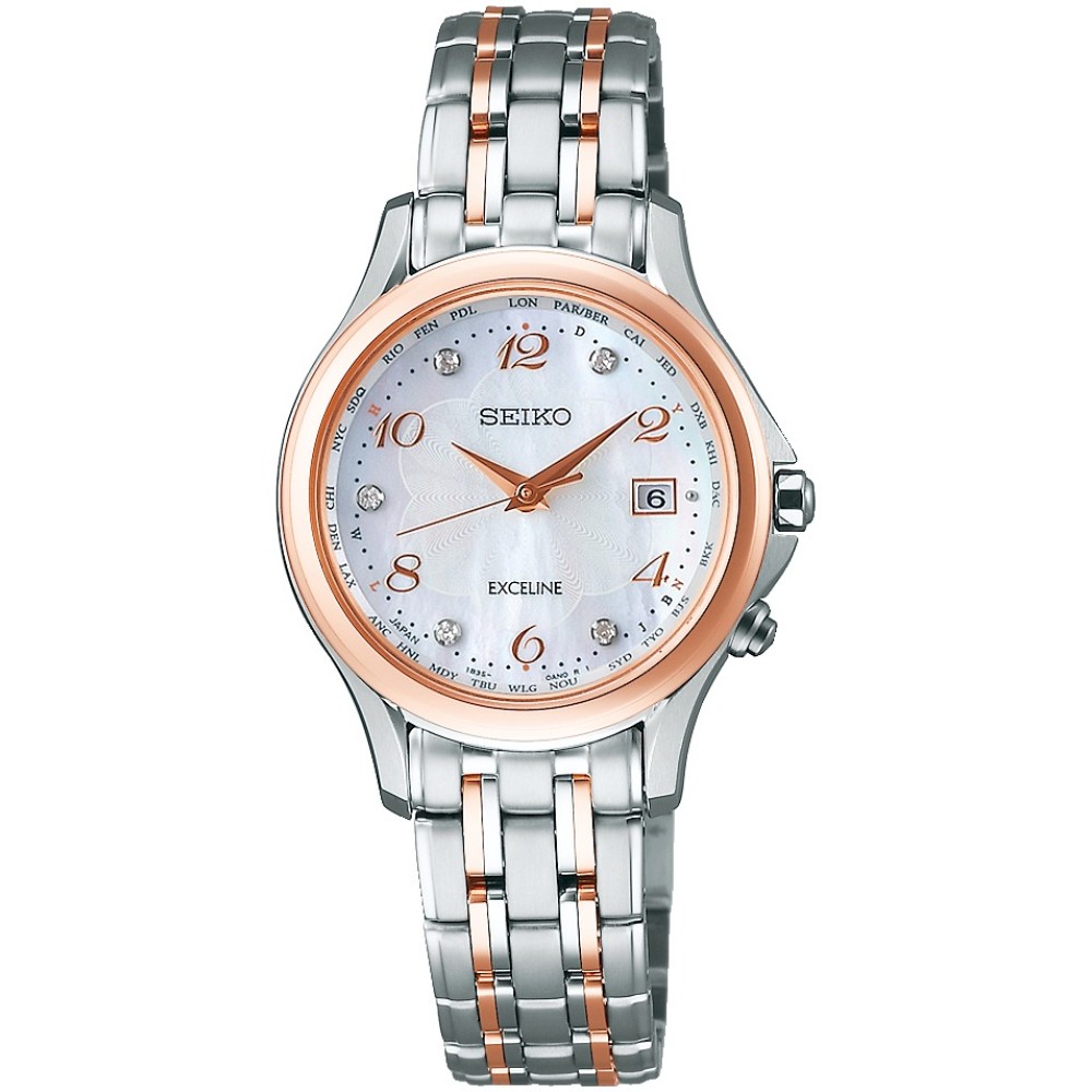 Seiko Exceline 2018 Good Couple's Day Limited Model SWCW164 - ladies watch made by Seiko. It is equipped with Japanese solar quartz movement and 1B35 calibre. Titanium, hard coating, gold plated case of round shape. Case dimensions are 28 mm. in diameter and 7.9 mm. in thickness. The dial of this Seiko watch is white. Display type: analog. This timepiece has sapphire, super clear coating glass. Titanium, hard coating, gold plated band, band color: silver, gold. 100 m. water resistance. The watch is from Seiko Dolce & Exceline collection. The following features are equipped: date, antimagnetic, diamond set, limited edition, radio controlled, perpetual calendar, world time.