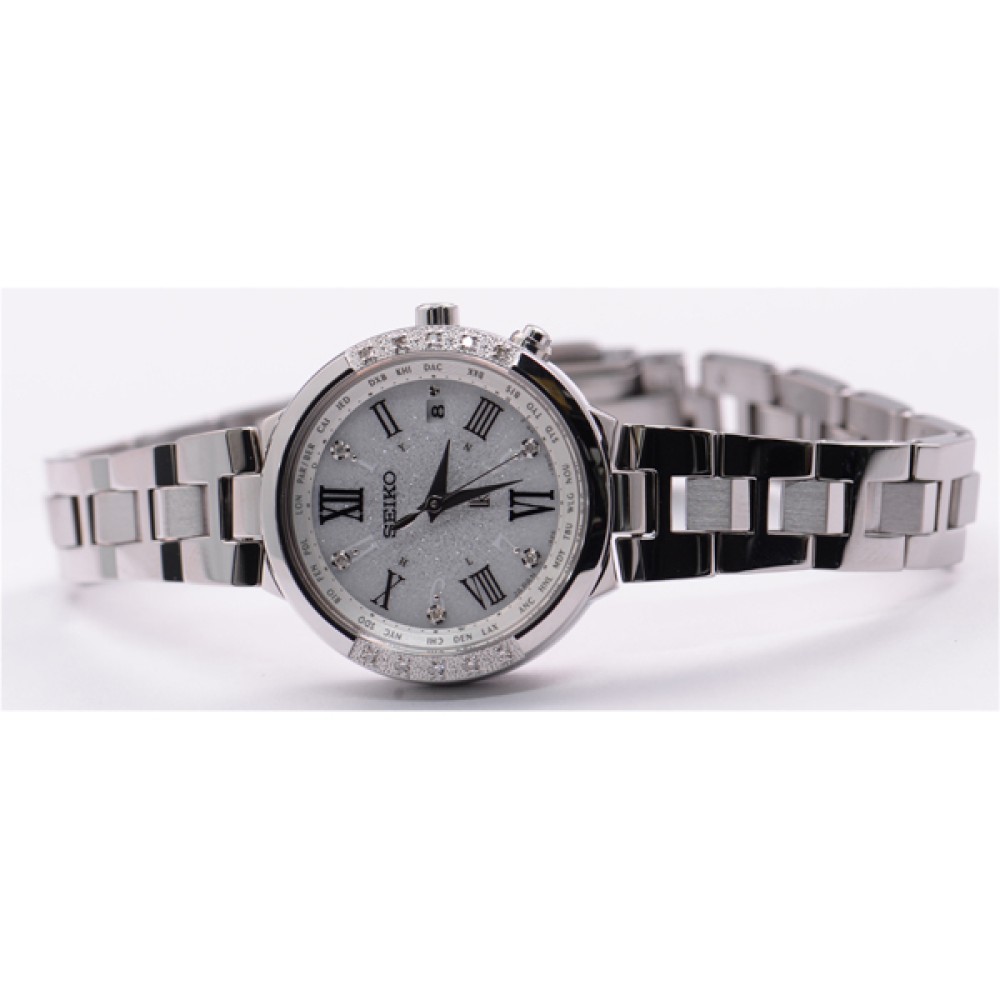 Seiko Lukia SSVV029 - ladies watch produced by Seiko. It is equipped with Japanese solar quartz movement and 1B25 calibre. Stainless steel, hard coating case of round shape. Case dimensions are 28 mm. in diameter and 9.1 mm. in thickness. The dial of this Seiko watch is silver, white. Display type: analog. This timepiece has sapphire, super clear coating glass. Stainless steel, hard coating band, band color: silver. 100 m. water resistance. The watch is from Seiko Lukia collection. The following features are equipped: antimagnetic, date, radio controlled, perpetual calendar, world time, diamond set, limited edition.