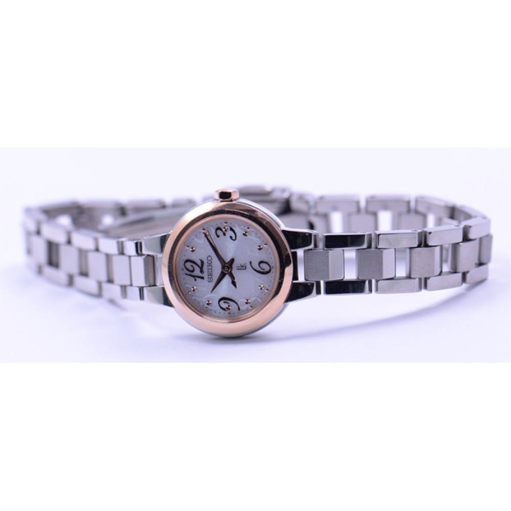 Seiko Lukia SSVR126 - ladies watch manufactured by Seiko. It has Japanese solar quartz movement and V117 calibre. Stainless steel, gold plated, hard coating case of round shape. Case dimensions are 22.4 mm. in diameter and 6.2 mm. in thickness. The dial of this Seiko watch is white. Display type: analog. This timepiece has sapphire, super clear coating glass. Stainless steel, hard coating band, band color: silver. 100 m. water resistance. The watch is from Seiko Lukia collection. The following features are equipped: antimagnetic.
