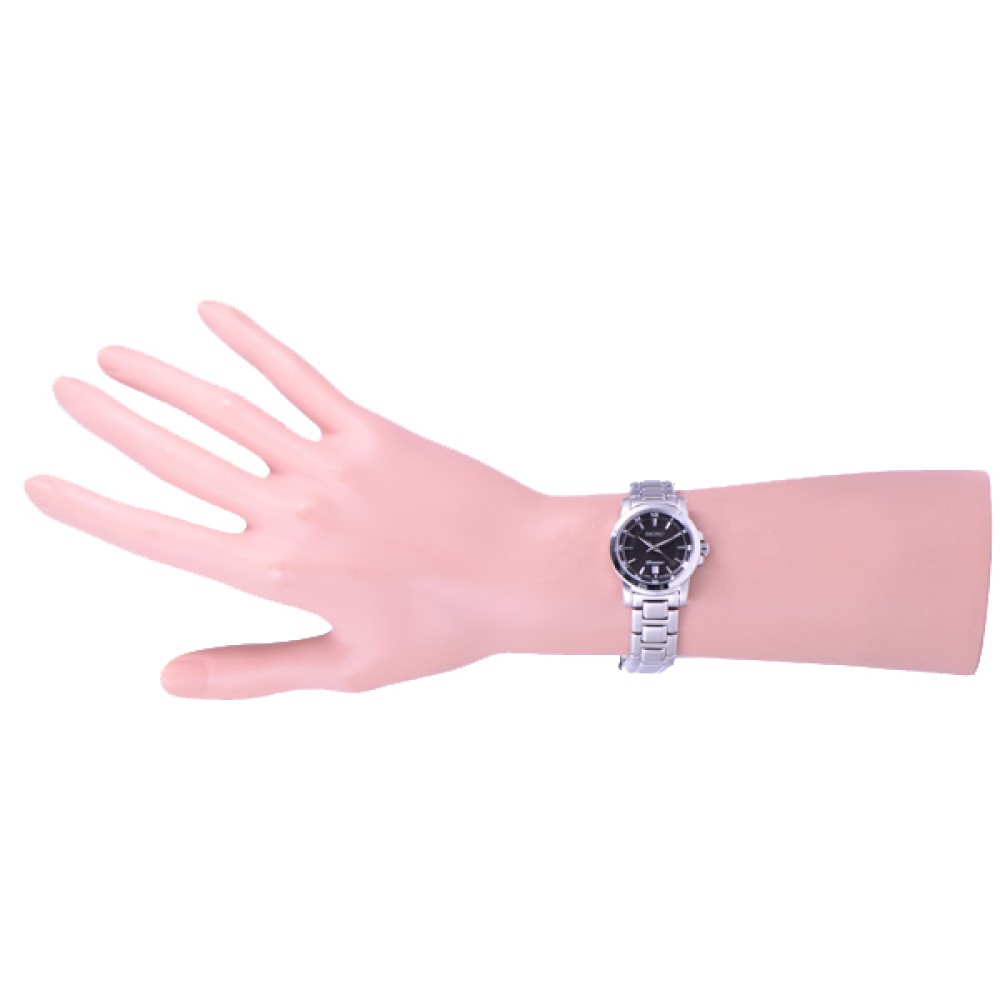 Seiko Premier SRJB015 - ladies watch made by Seiko. It has Japanese quartz movement and 7N82 calibre. Stainless steel case of round shape. Case dimensions are 27.5 mm. in diameter and 6.8 mm. in thickness. The dial of this Seiko watch is black. Display type: analog. This timepiece has sapphire glass. Stainless steel band, band color: silver. 100 m. water resistance. The watch is from Seiko Premier collection. The following features are equipped: antimagnetic, date.