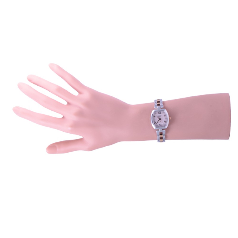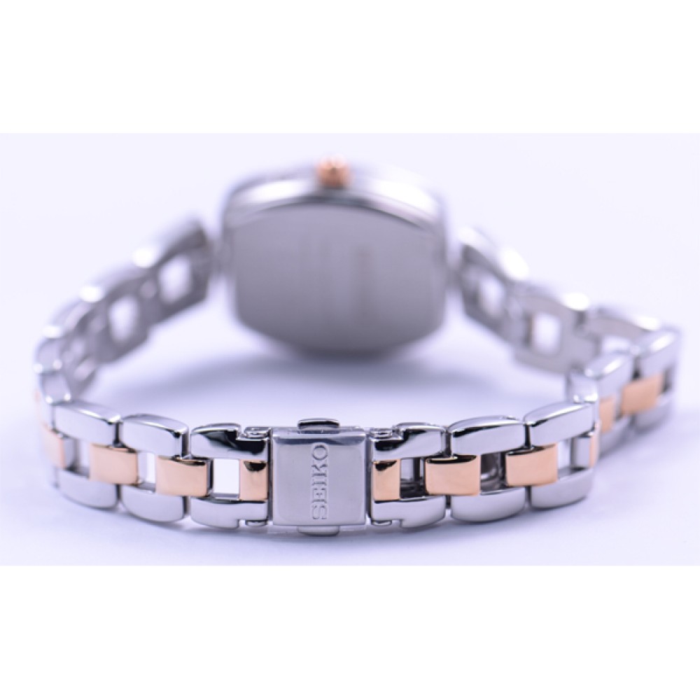Seiko Selection SWFH037 - ladies watch manufactured by Seiko. It is equipped with Japanese solar quartz movement and 1B21 calibre. Stainless steel case of tonneau shape. Case dimensions are 24.8 mm. in diameter and 8.7 mm. in thickness. The dial of this Seiko watch is pink. Display type: analog. This timepiece has hardlex glass. Stainless steel, gold plated band, band color: silver, gold. 100 m. water resistance. The watch is from Seiko Selection collection. The following features are equipped: antimagnetic, radio controlled.