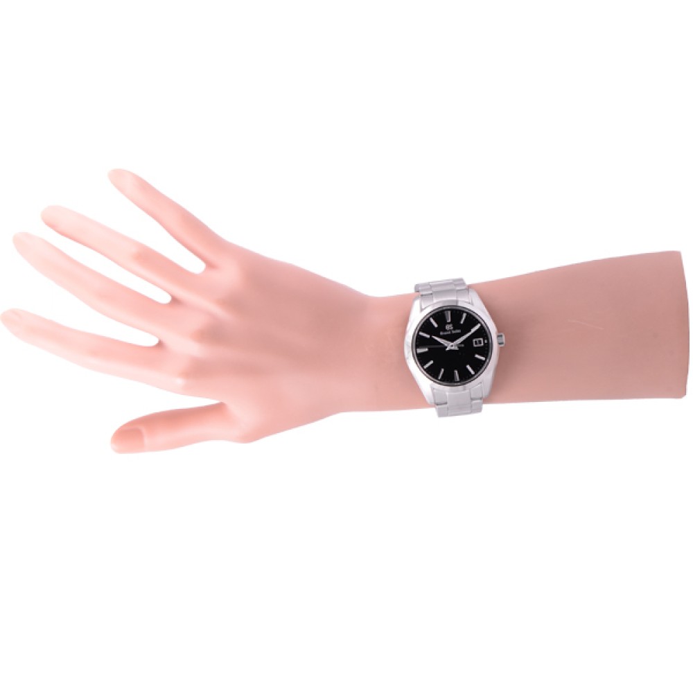 Grand Seiko SBGV223 - men's watch produced by Seiko. It has Japanese quartz movement and 9F82 calibre. Stainless steel case of round shape. Case dimensions are 40 mm. in diameter and 10 mm. in thickness. The dial of this Grand Seiko watch is black. Display type: analog. This timepiece has sapphire, antireflection coating glass. Stainless steel band, band color: silver. 100 m. water resistance. The watch is from Heritage collection. The following features are equipped: antimagnetic, date.