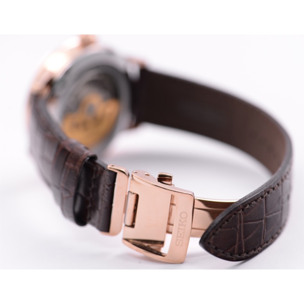 Seiko Presage SARY082 - ladies watch made by Seiko. It is equipped with Japanese automatic movement and 4R57 calibre. Stainless steel, gold plated case of round shape. Case dimensions are 40.5 mm. in diameter and 14.4 mm. in thickness. The dial of this Seiko watch is silver. Display type: analog. This timepiece has hardlex glass. Leather band, band color: brown. 50 m. water resistance. The watch is from Seiko Presage collection. The following features are equipped: antimagnetic, date, power reserve indicator.