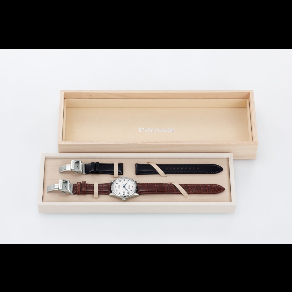 Seiko Presage SARA017 - men's watch manufactured by Seiko. It is equipped with Japanese automatic movement and 6L35 calibre. Stainless steel, hard coating case of round shape. Case dimensions are 39.5 mm. in diameter and 10.9 mm. in thickness. The dial of this Seiko watch is white. Display type: analog. This timepiece has sapphire, antireflection coating glass. Crocodile leather band, band color: brown, black. 30 m. water resistance. The watch is from Seiko Presage collection. The following features are equipped: date, antimagnetic.