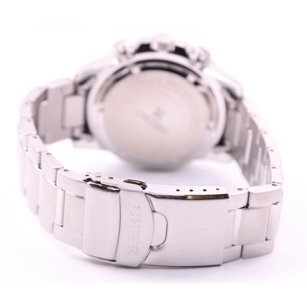 Seiko Prospex SBDL029 - men's watch produced by Seiko. It is equipped with Japanese solar quartz movement and V172 calibre. Stainless steel case of round shape. Case dimensions are 43 mm. in diameter and 12.3 mm. in thickness. The dial of this Seiko watch is black. Display type: analog. This timepiece has hardlex glass. Stainless steel band, band color: silver. 100 m. water resistance. The watch is from Seiko Prospex collection. The following features are equipped: date, alarm, chronograph, glowing hands, glowing markers.