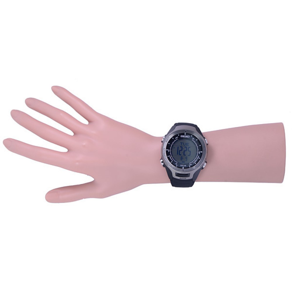 Seiko Prospex SBEL001 - men's watch made by Seiko. It is equipped with Japanese solar quartz movement and S830 calibre. Polymer, aluminum case of round shape. Case dimensions are 48.1 mm. in diameter and 13.6 mm. in thickness. The dial of this Seiko watch is lcd. Display type: digital. This timepiece has hardlex glass. Polymer band, band color: black. 100 m. water resistance. The watch is from Seiko Prospex collection. The following features are equipped: date, day, chronograph, alarm, perpetual calendar, world time, backlight, altimeter, barometer, thermometer, compass, bluetooth.