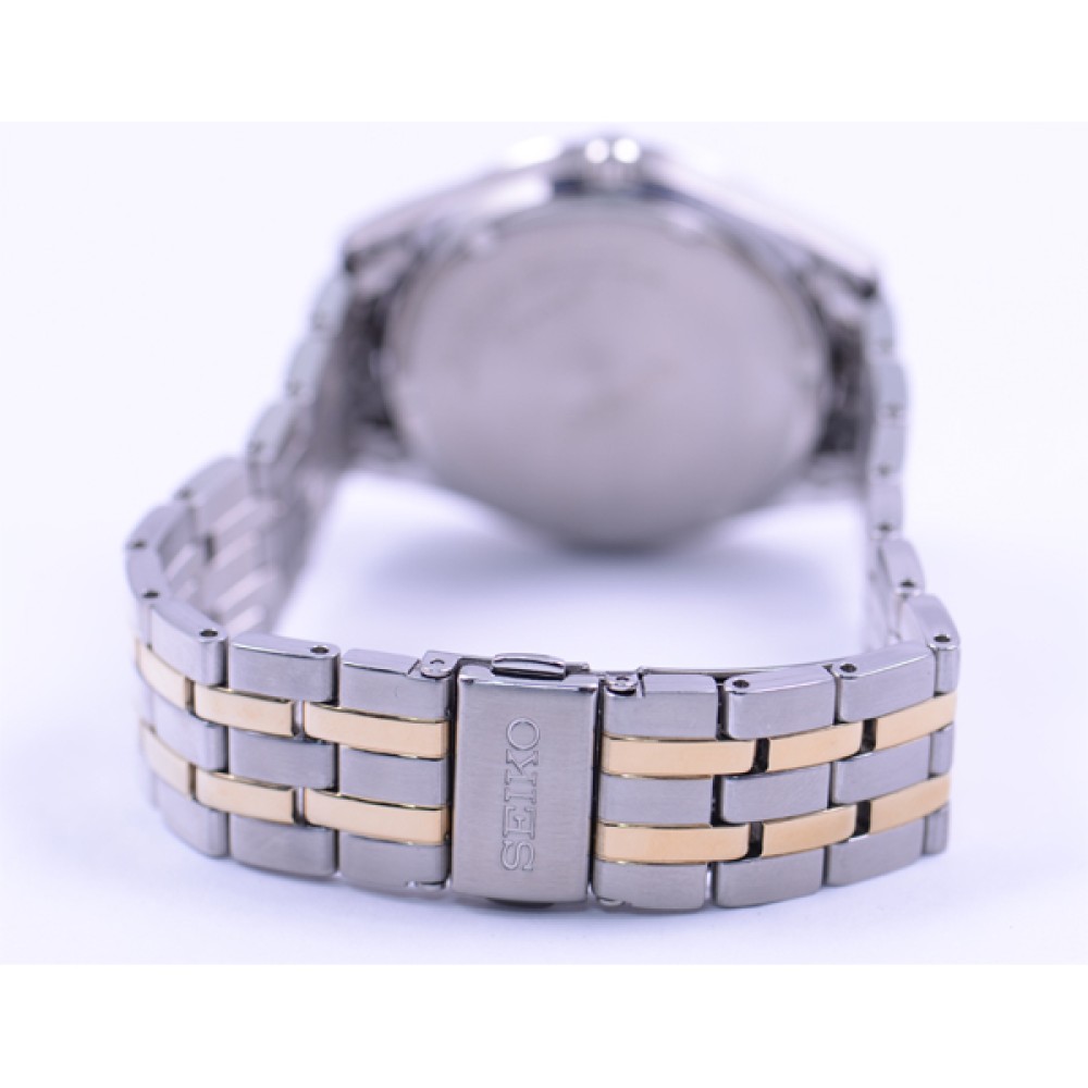 Seiko Selection SBPX085 - men's watch produced by Seiko. It has Japanese solar quartz movement and V158 calibre. Stainless steel case of round shape. Case dimensions are 37.4 mm. in diameter and 9.2 mm. in thickness. The dial of this Seiko watch is white. Display type: analog. This timepiece has sapphire glass. Stainless steel, gold plated band, band color: silver, gold. 30 m. water resistance. The watch is from Seiko Selection collection. The following features are equipped: date, day.