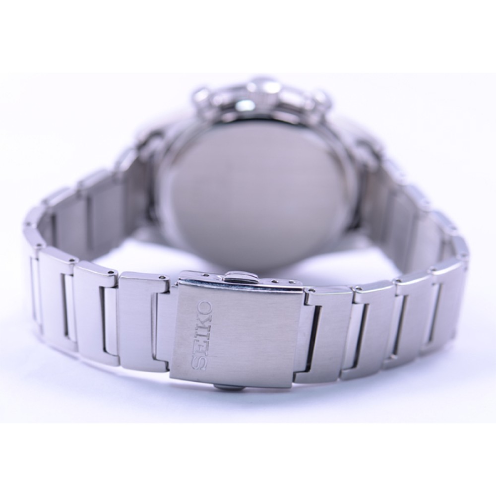 Seiko Spirit SBPY115 - men's watch produced by Seiko. It is equipped with Japanese solar quartz movement and V172 calibre. Stainless steel case of round shape. Case dimensions are 41 mm. in diameter and 11.4 mm. in thickness. The dial of this Seiko watch is blue. Display type: analog. This timepiece has sapphire glass. Stainless steel band, band color: silver. 100 m. water resistance. The watch is from Spirit collection. The following features are equipped: date, chronograph, alarm.