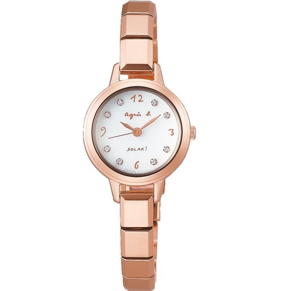 Seiko agnes.b Marcello! FBSD950 - ladies watch manufactured by Seiko. It has Japanese solar quartz movement and V117 calibre. Stainless steel, gold plated case of round shape. Case dimensions are 22 mm. in diameter and 7.1 mm. in thickness. The dial of this Seiko watch is white. Display type: analog. This timepiece has hardlex glass. Stainless steel, gold plated band, band color: gold. 50 m. water resistance. The watch is from agnes b. collection. The following features are equipped: crystal set.