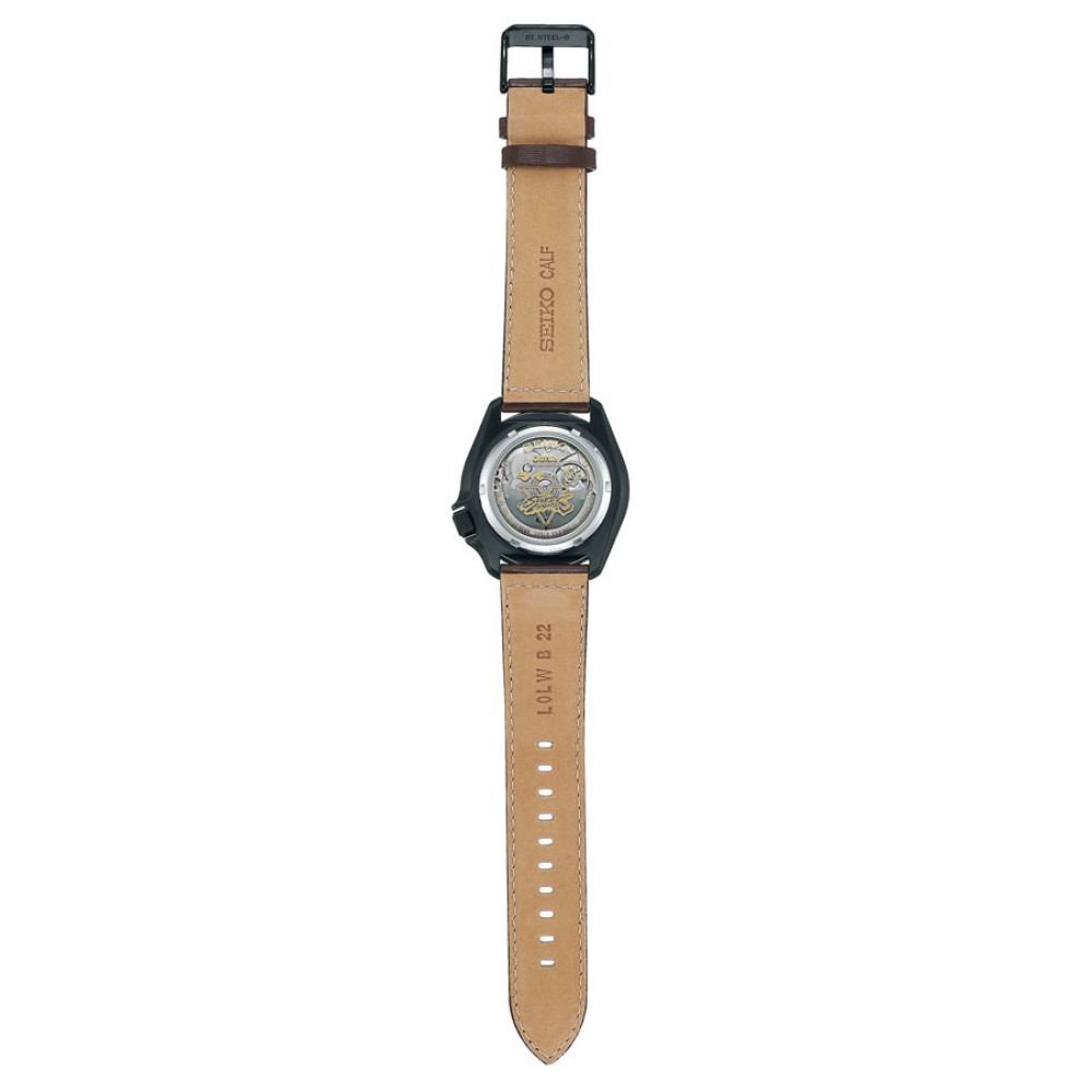 Seiko 5 Sports Street Fighter V Collaboration Guile Limited Model SBSA081 - men's watch manufactured by Seiko. It is equipped with Japanese automatic movement and 4R36 calibre. Stainless steel, hard coating case of round shape. Case dimensions are 42.5 mm. in diameter and 13.4 mm. in thickness. The dial of this Seiko watch is green. Display type: analog. This timepiece has hardlex glass. Leather band, band color: brown. 100 m. water resistance. The watch is from 5 Sports collection. The following features are equipped: date, day, glowing hands, glowing markers, limited edition, antimagnetic.