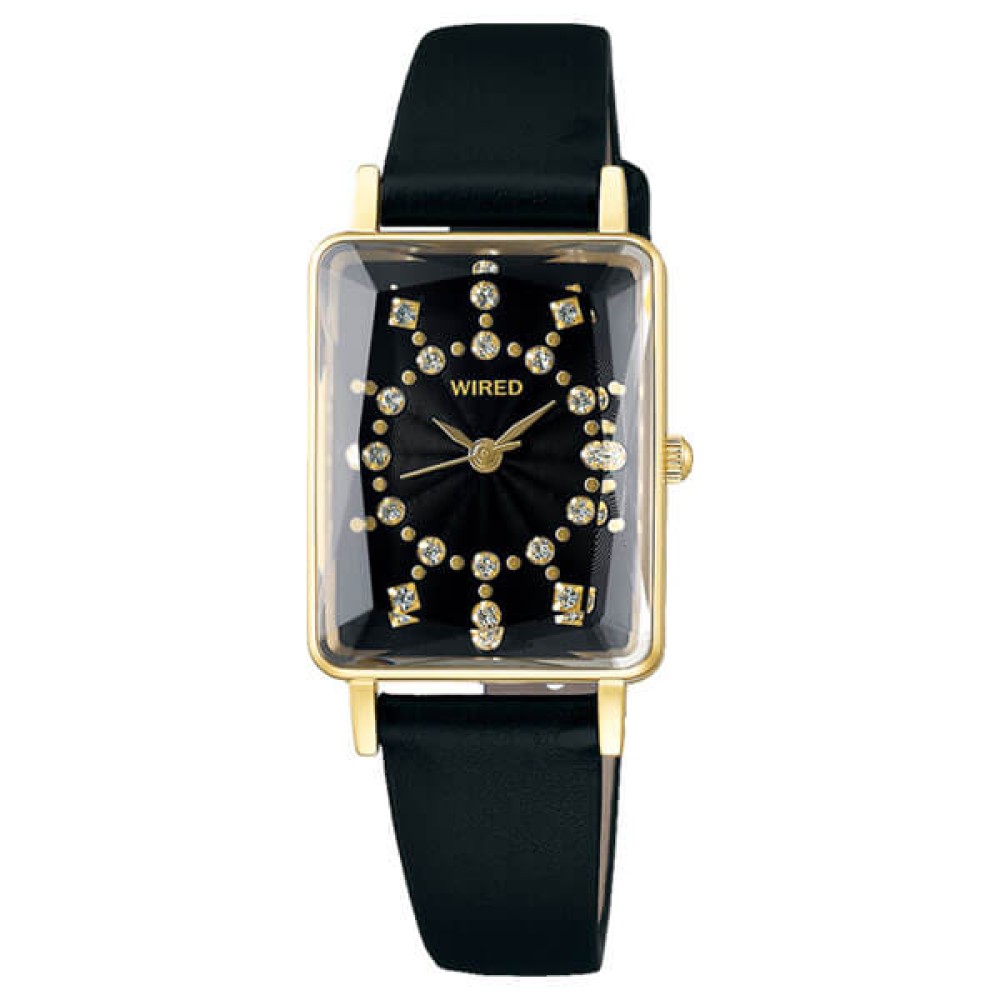 Seiko Wired F Tokyo Girl Mix AGEK453 - ladies watch made by Seiko. It is equipped with Japanese quartz movement and VJ21 calibre. Stainless steel, gold plated case of rectangle shape. Case dimensions are 21.1 mm. in diameter and 8.45 mm. in thickness. The dial of this Seiko watch is black. Display type: analog. This timepiece has hardlex glass. Leather band, band color: black. 50 m. water resistance. The watch is from Wired collection. The following features are equipped: crystal set.