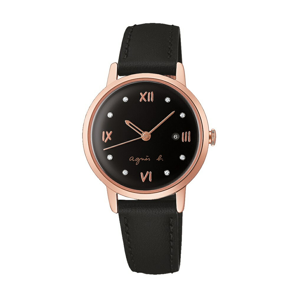 Seiko agnes b. FCSK912 - ladies watch produced by Seiko. It is equipped with Japanese quartz movement and VJ22 calibre. Stainless steel, gold plated case of round shape. Case dimensions are 30 mm. in diameter and 8 mm. in thickness. The dial of this Seiko watch is black. Display type: analog. This timepiece has hardlex glass. Leather band, band color: black. 50 m. water resistance. The watch is from agnes b. collection. The following features are equipped: date, crystal set.