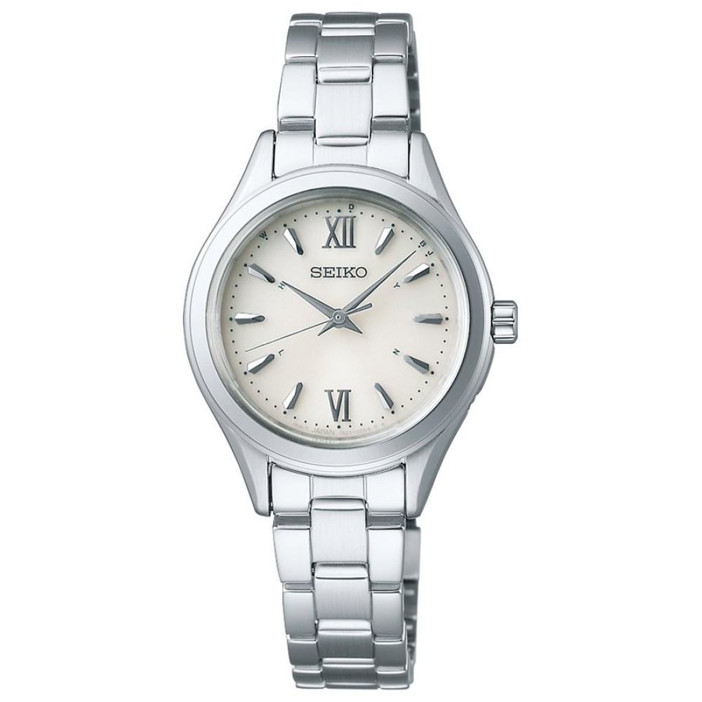 Seiko Selection Solar Radio SWFH111 - ladies watch made by Seiko. It has Japanese solar quartz movement and 1B21 calibre. Stainless steel case of round shape. Case dimensions are 28 mm. in diameter and 8.3 mm. in thickness. The dial of this Seiko watch is beige. Display type: analog. This timepiece has hardlex glass. Stainless steel band, band color: silver. 100 m. water resistance. The watch is from Seiko Selection collection. The following features are equipped: antimagnetic, radio controlled.