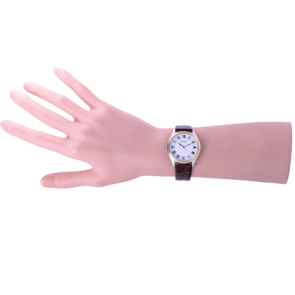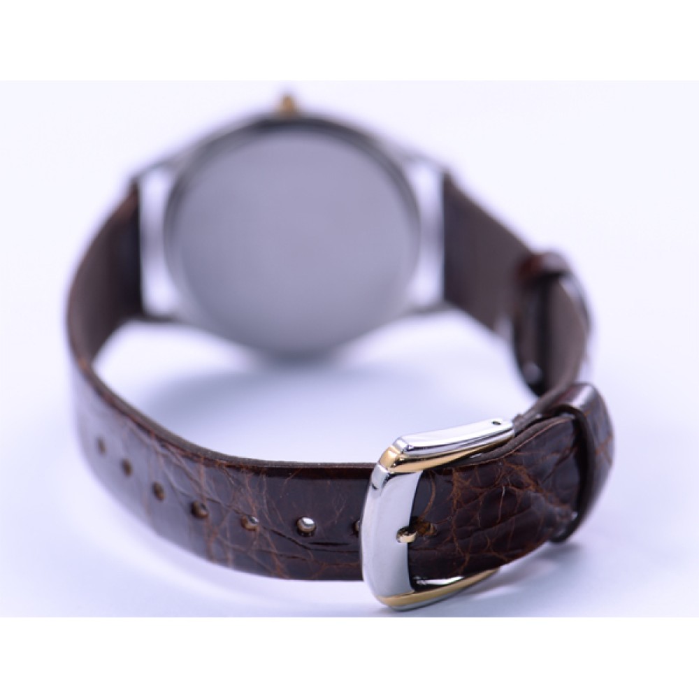 Seiko Dolce SACM152 - men's watch made by Seiko. It has Japanese quartz movement and 8J41 calibre. Stainless steel, gold plated case of round shape. Case dimensions are 33.5 mm. in diameter and 5.3 mm. in thickness. The dial of this Seiko watch is white. Display type: analog. This timepiece has sapphire, antireflection coating glass. Caiman leather band, band color: brown. 30 m. water resistance. The watch is from Seiko Dolce & Exceline collection. The following features are equipped: antimagnetic.