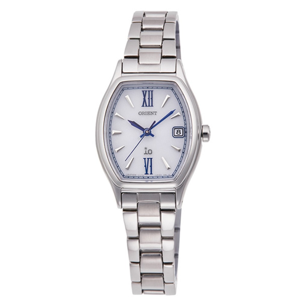Orient iO Natural & Plain RN-WG0011S - ladies watch manufactured by Orient. It has Japanese solar quartz movement and KN700 calibre. Stainless steel case of tonneau shape. Case dimensions are 24.1 mm. in diameter and 7.8 mm. in thickness. The dial of this Orient watch is white. Display type: analog. This timepiece has sapphire glass. Stainless steel band, band color: silver. 50 m. water resistance. The watch is from IO collection. The following features are equipped: date.