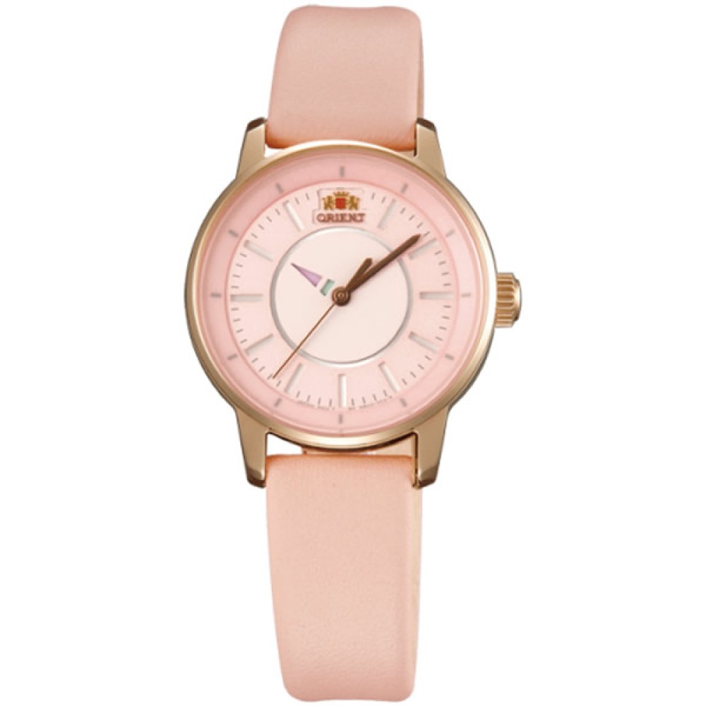 Orient Contemporary WV0031NB - ladies watch produced by Orient. It is equipped with Japanese automatic movement and 55542 calibre. Stainless steel, gold plated case of round shape. Case dimensions are 29 mm. in diameter and 11.3 mm. in thickness. The dial of this Orient watch is pink. Display type: analog. This timepiece has mineral glass. Leather band, band color: pink. 50 m. water resistance. The watch is from Contemporary collection. The following features are equipped: antimagnetic.