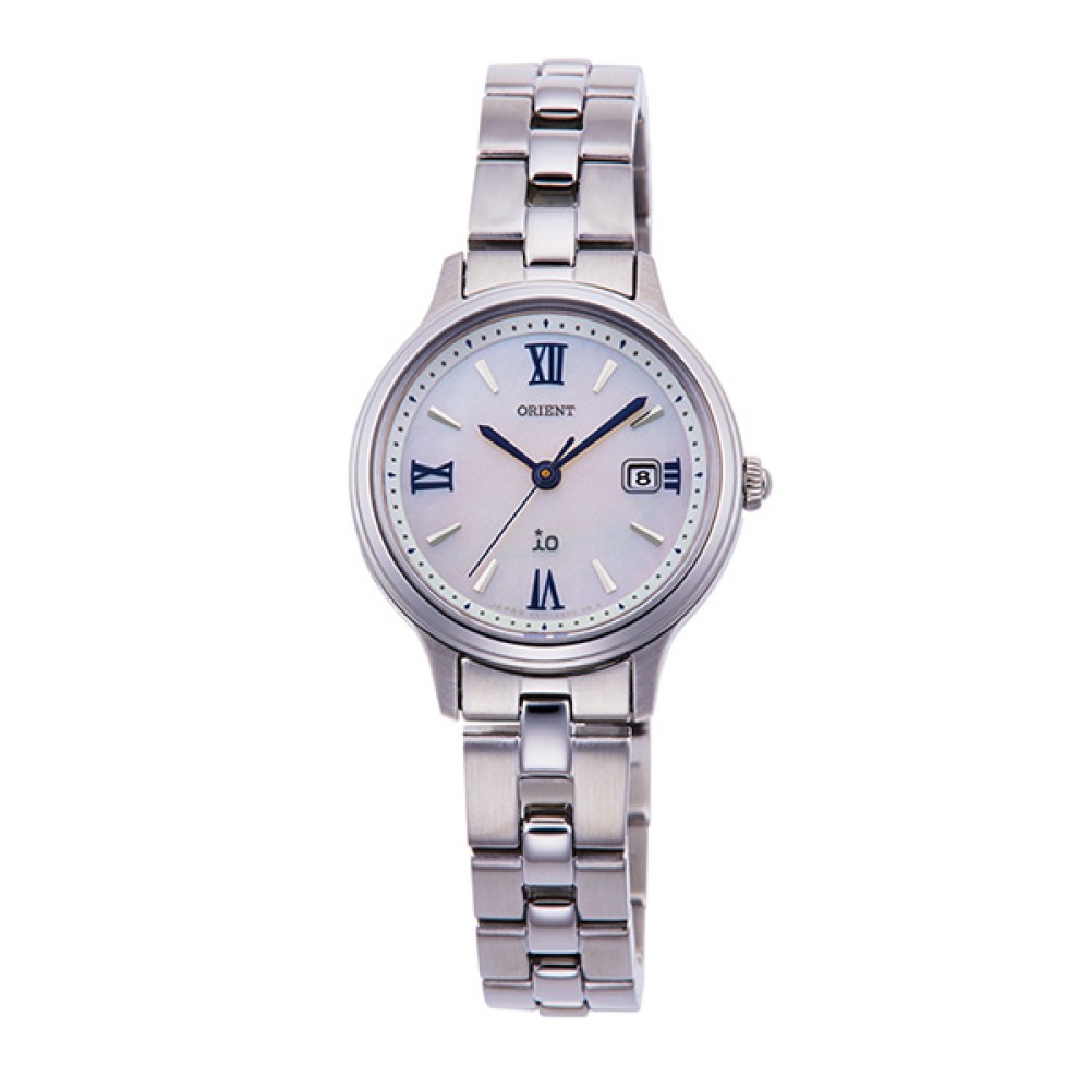 ORIENT IO RN-WG0007A - ladies watch produced by Orient. It is equipped with Japanese solar quartz movement and KN700 calibre. Stainless steel case of round shape. Case dimensions are 27.6 mm. in diameter and 7.1 mm. in thickness. The dial of this Orient watch is white. Display type: analog. This timepiece has sapphire glass. Stainless steel band, band color: silver. 50 m. water resistance. The watch is from IO collection. The following features are equipped: date.