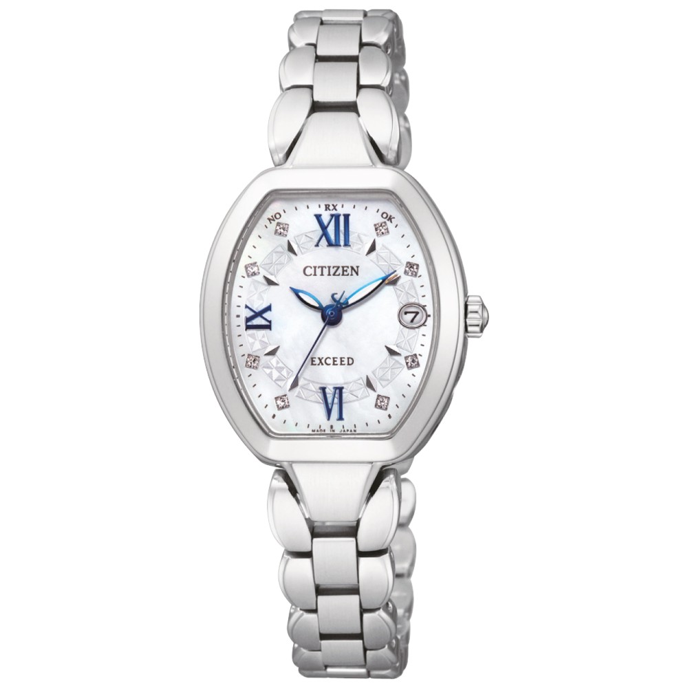 Citizen Exceed ES8060-65W - ladies watch produced by Citizen. It is equipped with Japanese solar quartz movement and H058 calibre. Titanium, hard coating case of tonneau shape. Case dimensions are 24 mm. in diameter and 8.4 mm. in thickness. The dial of this Citizen watch is mother of pearl. Display type: analog. This timepiece has sapphire, super clear coating glass. Titanium, hard coating band, band color: silver. 50 m. water resistance. The watch is from Exceed collection. The following features are equipped: date, radio controlled, perpetual calendar, antimagnetic, power reserve indicator, diamond set.