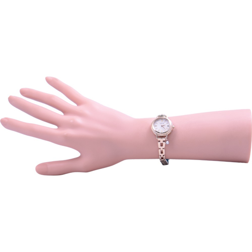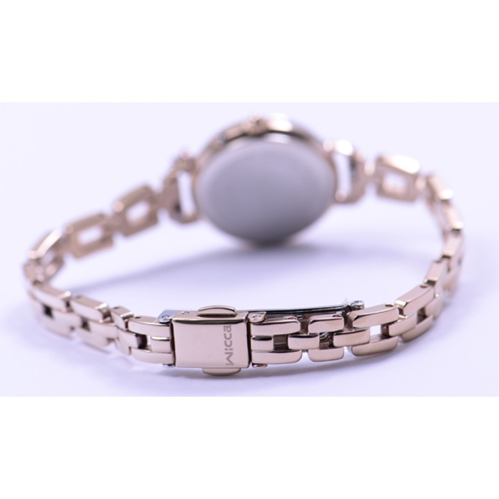 CITIZEN WICCA KL0-511-91 - ladies watch made by Citizen. It is equipped with Japanese solar quartz movement and H0F8 calibre. Stainless steel, gold plated case of round shape. Case dimensions are 25.5 mm. in diameter and 7.2 mm. in thickness. The dial of this Citizen watch is beige. Display type: analog. This timepiece has mineral glass. Stainless steel, gold plated band, band color: gold. 50 m. water resistance. The watch is from Wicca collection. The following features are equipped: antimagnetic, date, crystal set, perpetual calendar, radio controlled.