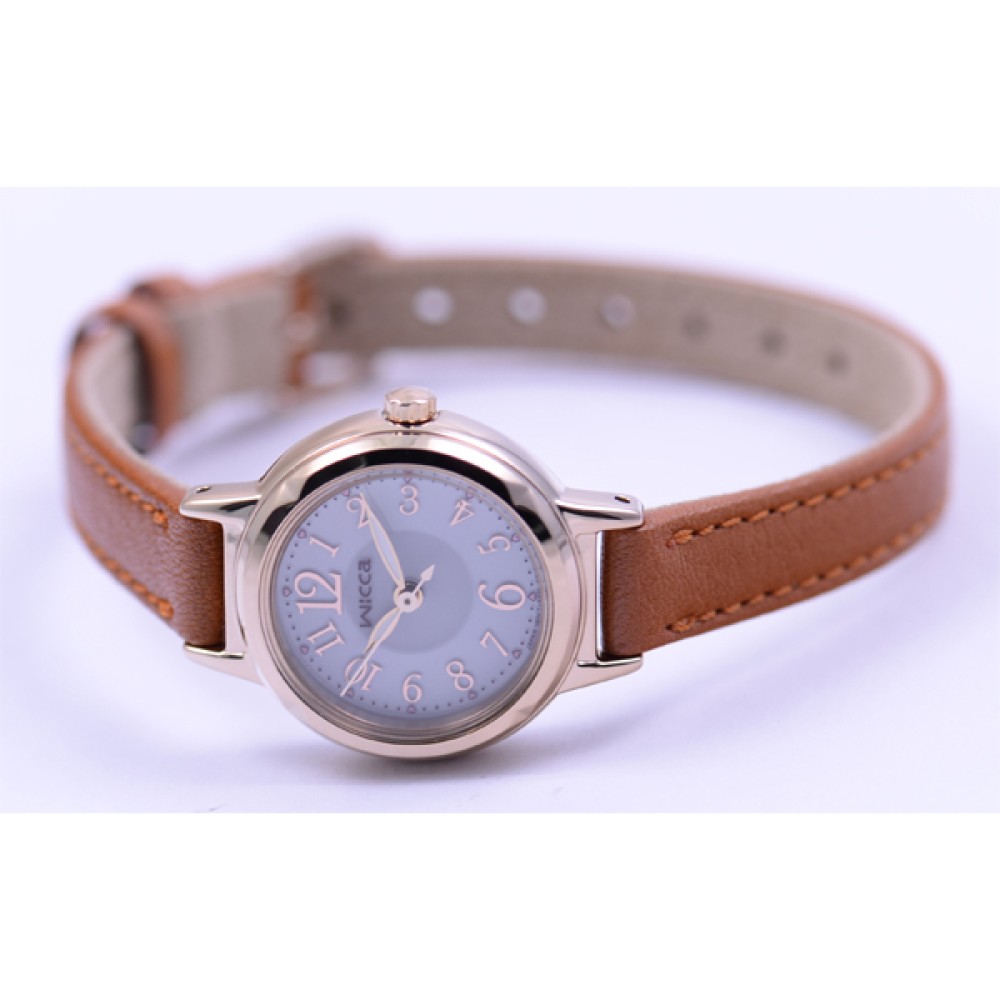 CITIZEN WICCA KH9-922-12 - ladies watch made by Citizen. It has Japanese solar quartz movement and E031 calibre. Stainless steel, gold plated case of round shape. Case dimensions are 24 mm. in diameter and 7.1 mm. in thickness. The dial of this Citizen watch is blue, white. Display type: analog. This timepiece has mineral glass. Leather band, band color: brown. 50 m. water resistance. The watch is from Wicca collection.